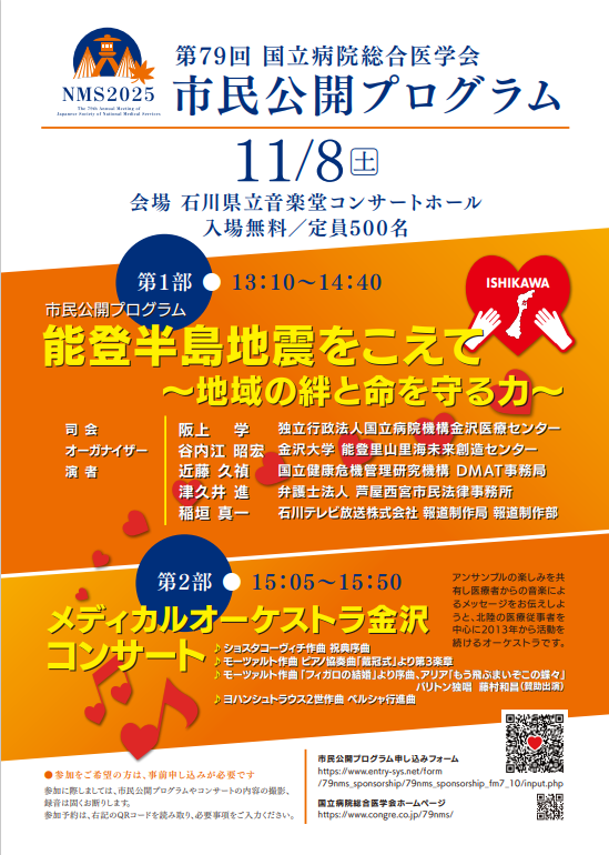 11月に金沢で開催される「国立病院総合医学会」の一環として、地域の皆様に向けた市民公開プログラムが開催されます。災害への備えの学びと、心の安らぎを得られる貴重な機会です。皆様、ご家族・ご友人をお誘い合わせの上、ぜひご参加ください。